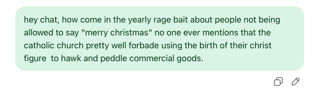 Historically, Catholic Church has never been cool with turning the birth of Christ into a sales event. The Church’s problem with modern Christmas isn’t “people won’t let us say Merry Christmas,” it’s that Christmas got hollowed out and refilled with cash registers.