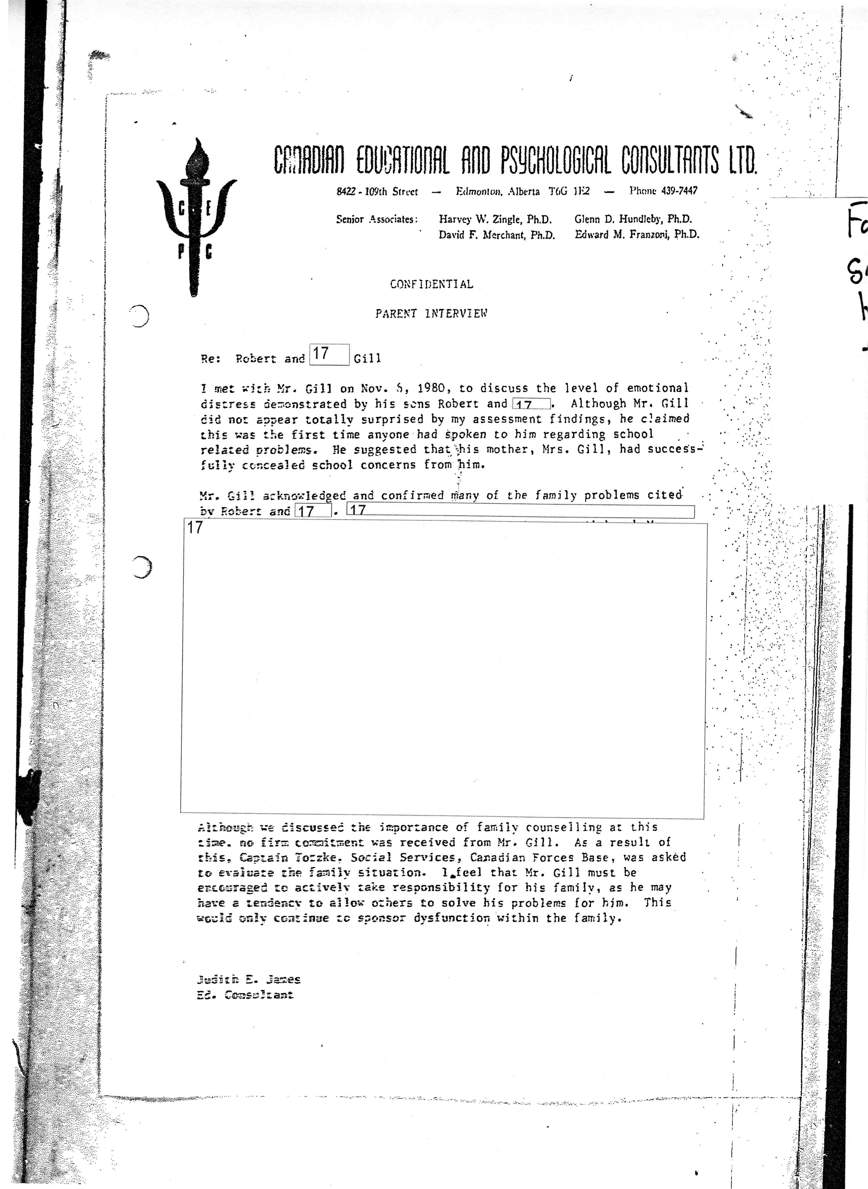 I had seen this document before. This was the interview of my father by Judith James, a psychologist that had been hired by the Canadian Armed Forces to evaluate my family after our school teachers and our principal complained to the military social worker about the issues my brother and I were having in school immediately after we arrived at CFB Griesbach from CFB Namao.