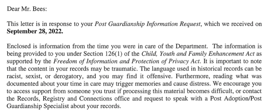 I had submitted this request as the oposing counsel in a civil matter that was wrapped up in 2022 had shown me quotes from my Alberta Social Service records that were redacted from the documents that I had obtained in August of 2011.