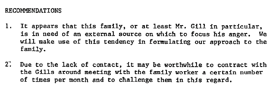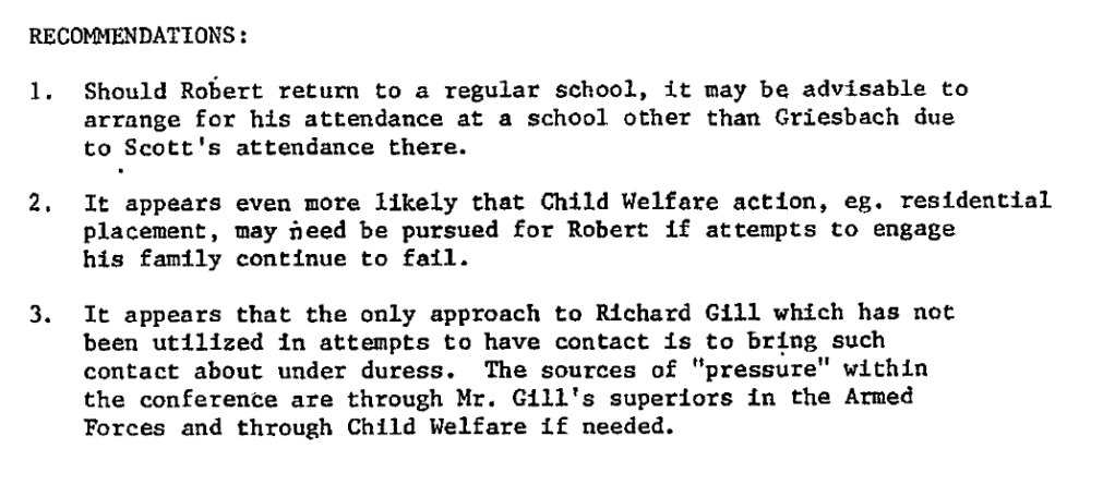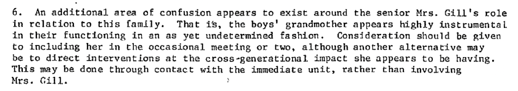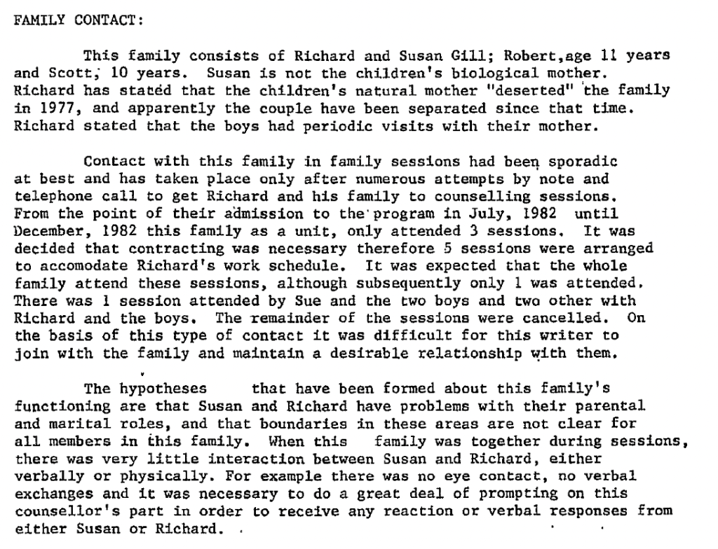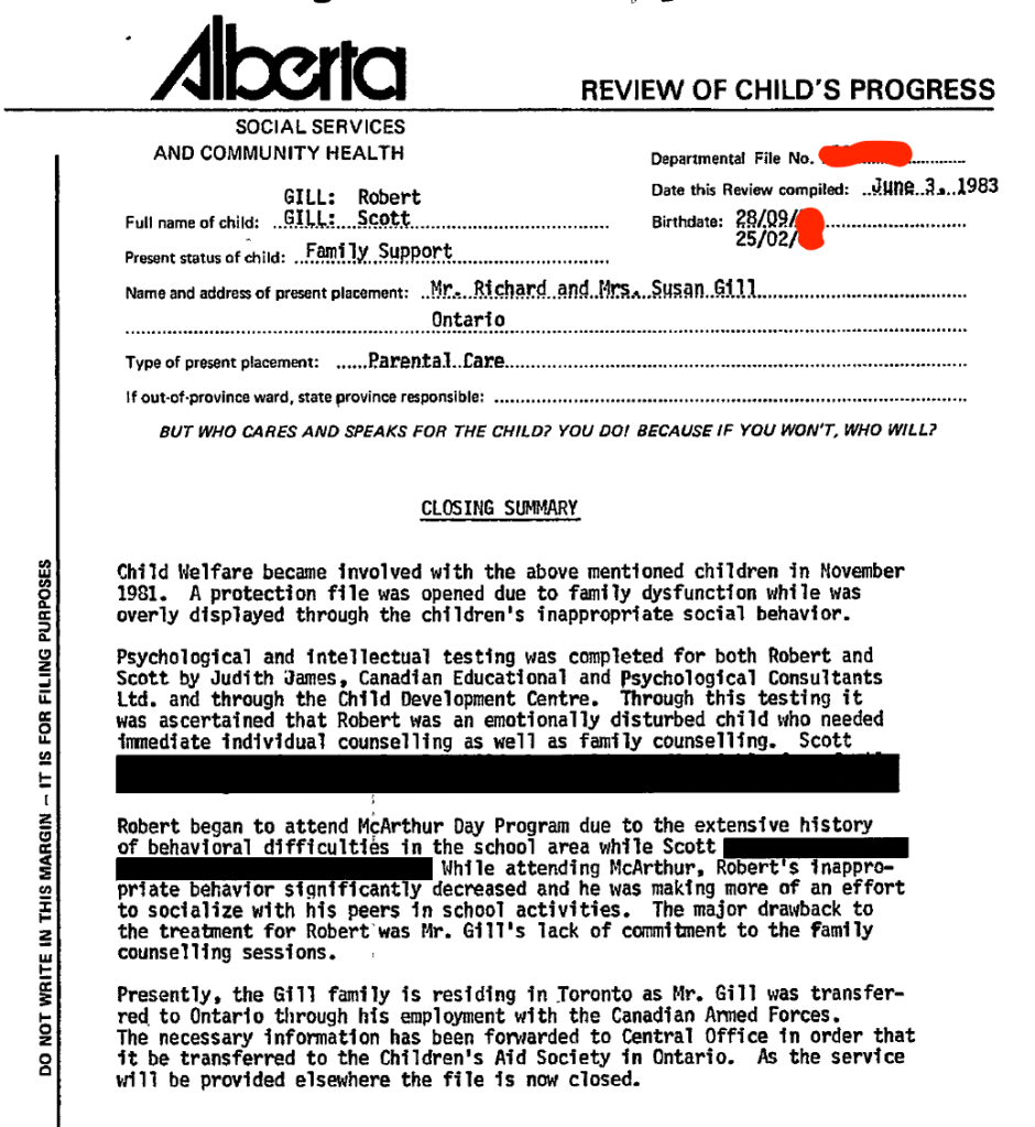 “Mr. Gill states that his mother is an alcoholic who refuses to seek help or treatment for her condition”. What an asshole. Richard was just as much of an alcoholic as Grandma was. Funnything was, Grandma’s alcoholism didn’t deter Richard from asking grandma to come live with us on Canadian Forces Base Summerside. And it didn’t deter him from asking Captain Lynda Tyrell for a compasionate posting in the summer of 1978 so that we could move to Canadian Forces Base Namao so grandma and her husband Andy Anderson could move into the PMQ on base to raise my brother and I. And no, Richard didn’t see anything wrong with expsoing Scott and I to grandma’s alcoholism from spring 1977 until spring 1981. Grandma’s alcoholism only became an issue when Richard had some explainging to do with Social Services.