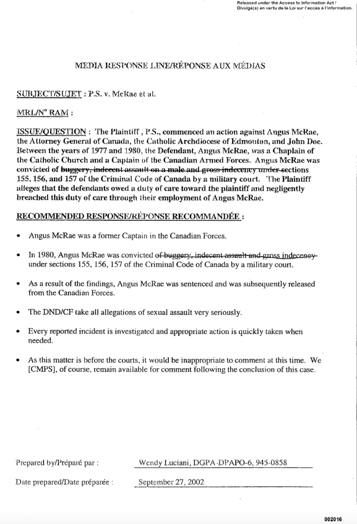 In November of 2008, the Director of Claims and Civil Liabilities indicated that the Department of National Defence was willing to make a cash offer to P.S. to have him discontinue his $4.5 million dollar action against DND in the Alberta Court of Queen’s Bench for the abuse he suffered at the hands of Captain McRae. This would have had to have been approved not only by CF Chain of Command, but also the Department of Justice as the DOJ serves as the lawyer for the Government of Canada.