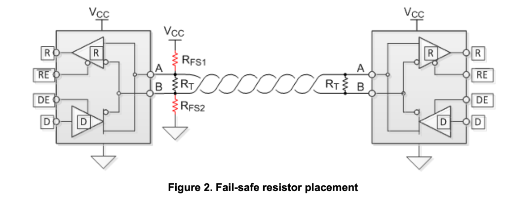 With this diagram as a reference, RFS1 = 4700 ohms, RT = 120 ohms, and RFS2 = 4700 ohms.