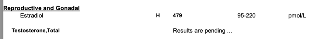 The August tests show that my estrogen levels can stand to go a little higher. Hopefully the “results are pending” for my testosterone levels indicate that my testosterone levels are so low that they’re running the samples again to make sure that they’re not misreading the results.