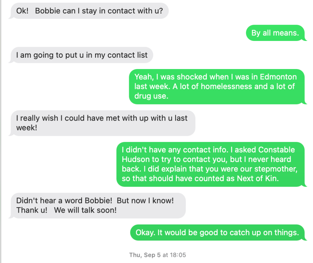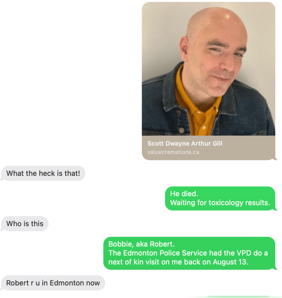 The next time that I heard anything about him was on August 14th, 2024 when I received a next-of-kin visit from the Vancouver Police Department at the request of the Edmonton Police Service.