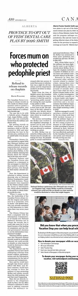 So imagine the military’s reluctance to prosecute Canadian Armed Forces OFFICER Captain Father Angus McRae for sexually abusing over 25 children on Canadian Forces Base Namao in direct view of the Base MP detachment.