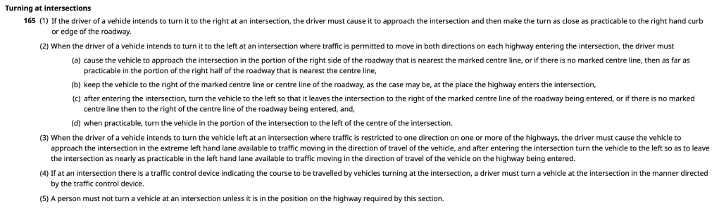 Under the motor vehicle act, a bicycle operator and an e-scooter operator wishing to turn left at an intersection must do so from the right side of the lane closest to the centre line of the road.