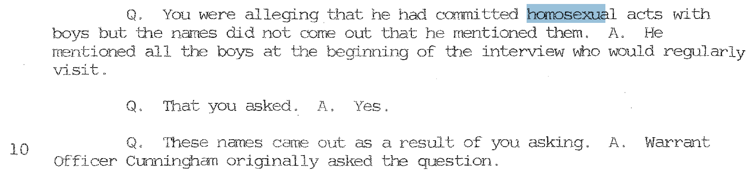 He first tried telling me that when the babysitter was found buggering me in the spring of 1980, that the babysitter was only 12 or 13 years of age. Next Cyr asked me if I knew anything about the base chaplain being charged with molesting children during the same period of time that I was accusing the babysitter of abusing me.